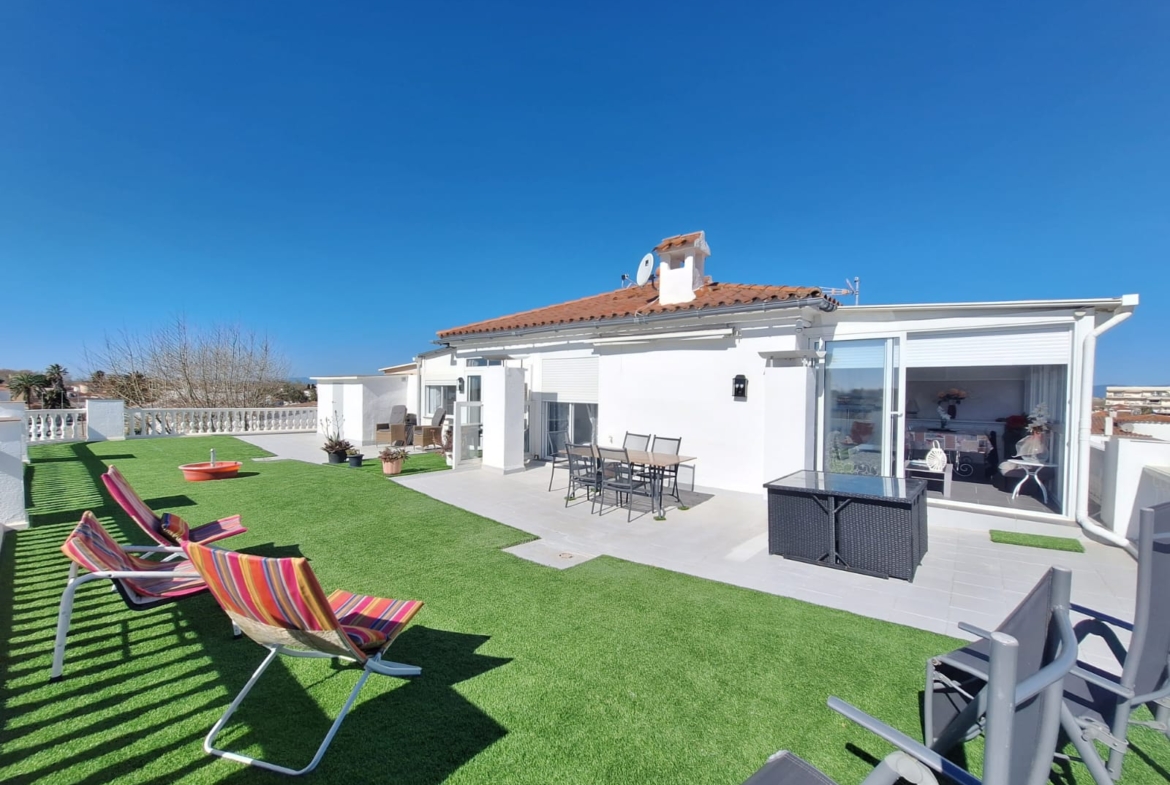 Aquest bon pis a l'última planta d'una tranquila residència té una enorme terrassa amb triple exposició, el que permet gaudir del sol durant tot el dia. Consta d'un hall d'entrada, una zona d'estar principal amb saló, comedor i porxo que s'accedeix a la terrassa enorme. En la part de nit, hi ha un primer dormitori amb una cama de matrimoni, després un segon dormitori amb dos llits individuals i, per últim, un quart de bany complet amb la dutxa a la italiana, lavabo i WC. Extra: aire condicionat reversible