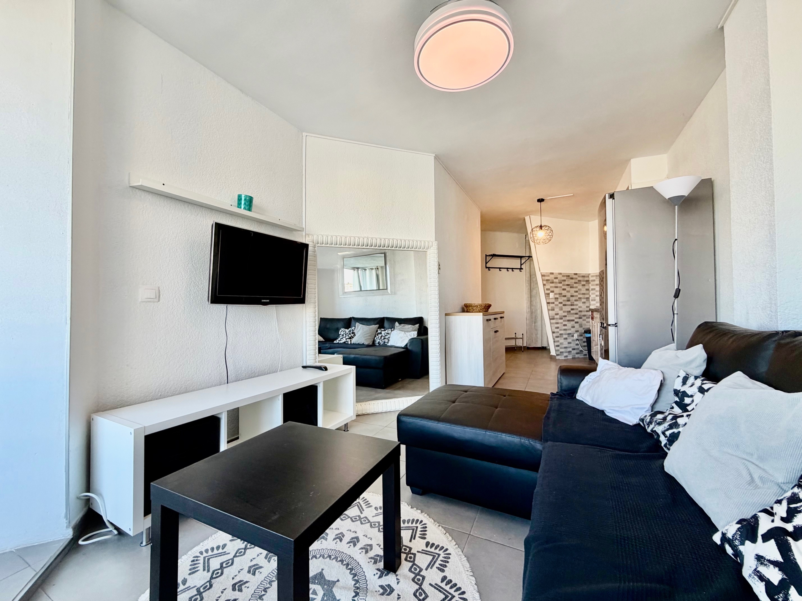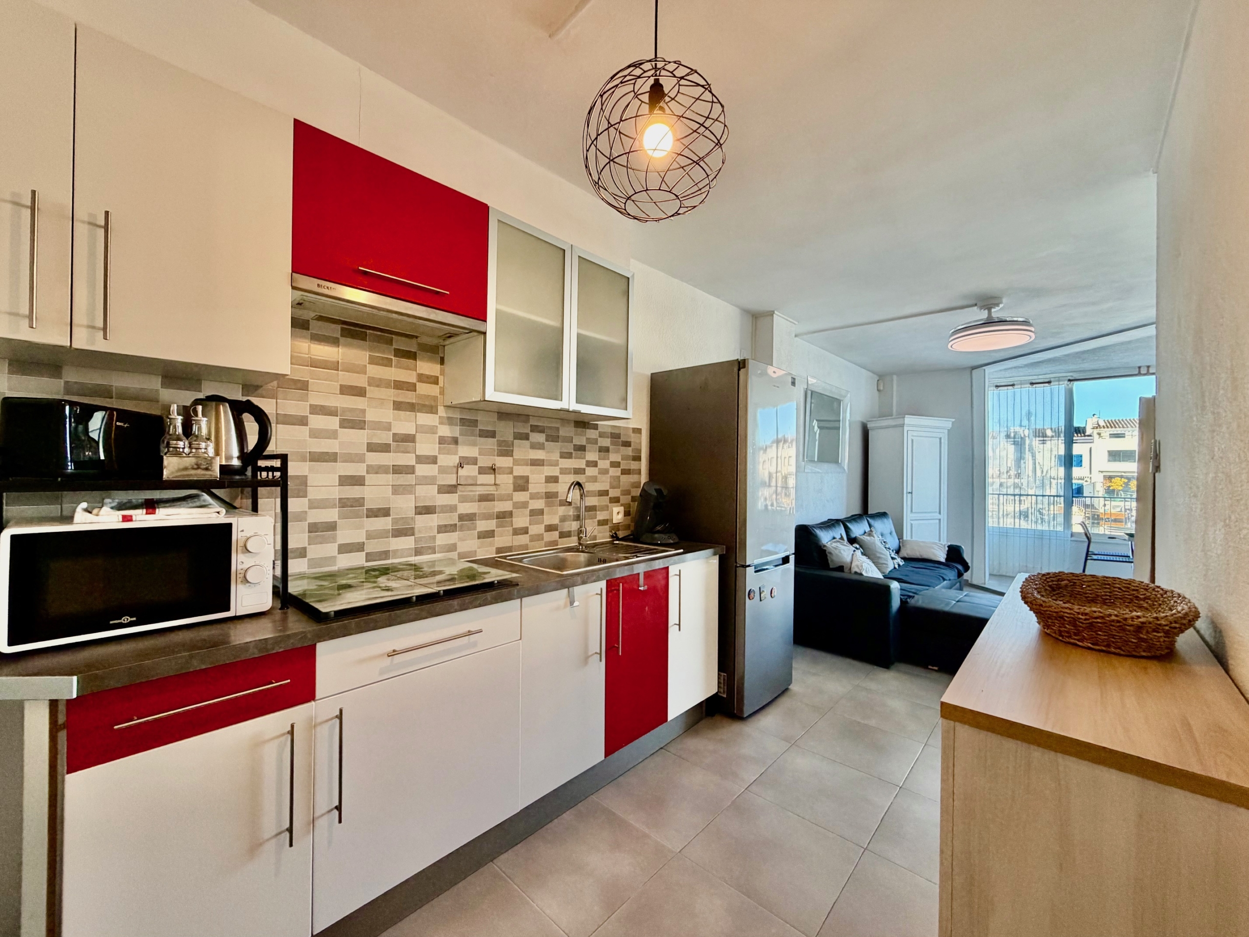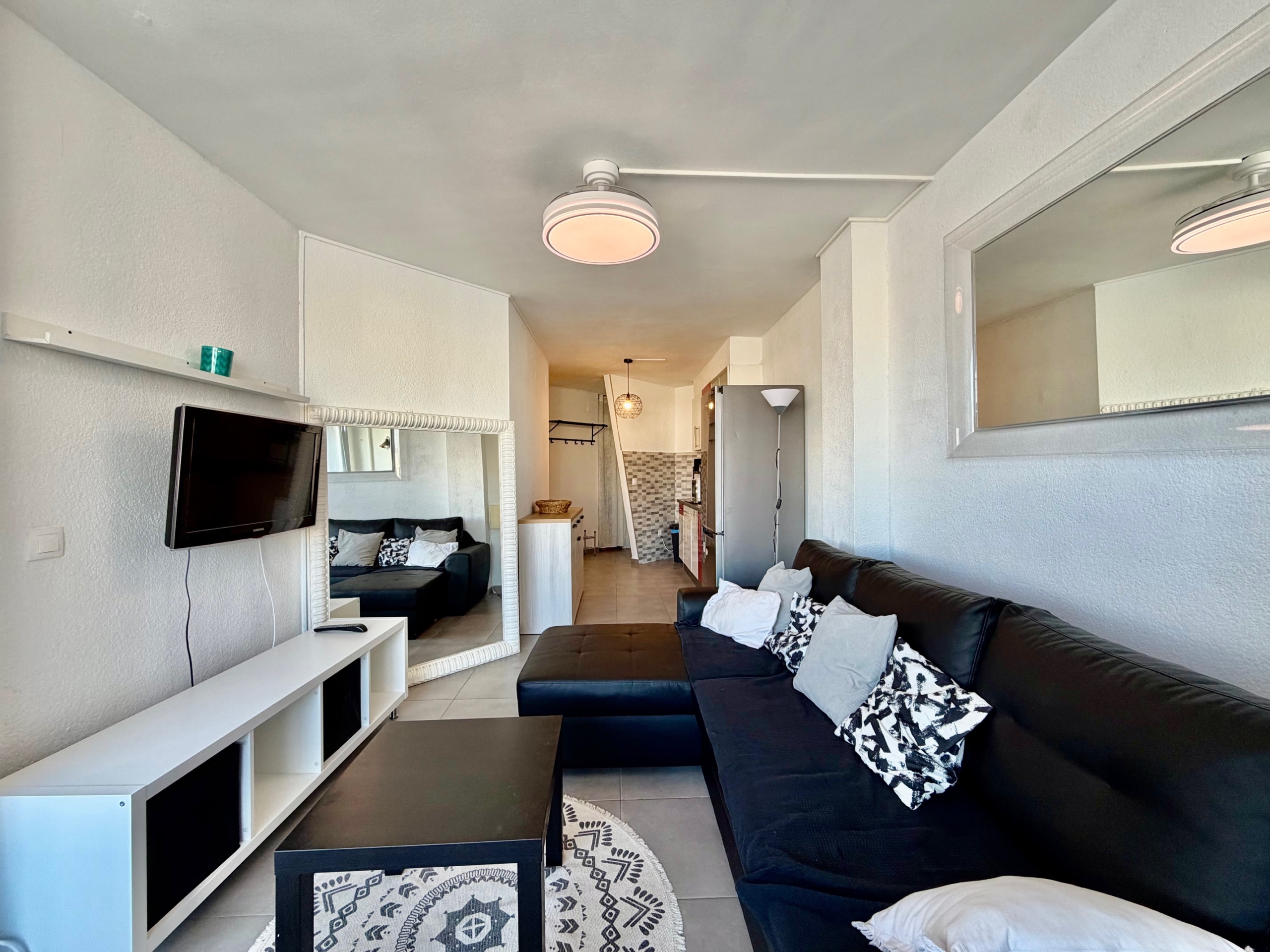 Die Wohnung verfügt über einen Eingangsbereich, der zu einem hellen Wohn-/Esszimmer mit einer voll ausgestatteten offenen Küche führt. Vom Wohnzimmer aus gelangt man auf eine angenehme, geschlossene Terrasse, die sich ideal für den ganzjährigen Genuss eignet und einen schönen Blick auf den Kanal bietet.