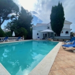 On the outside of the house we can access from the living room there is a covered terrace area with a dining room and a lounge with sofas, the terrace area leads to the heated pool and garden area with grass and plants.