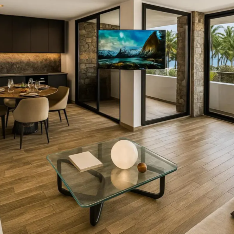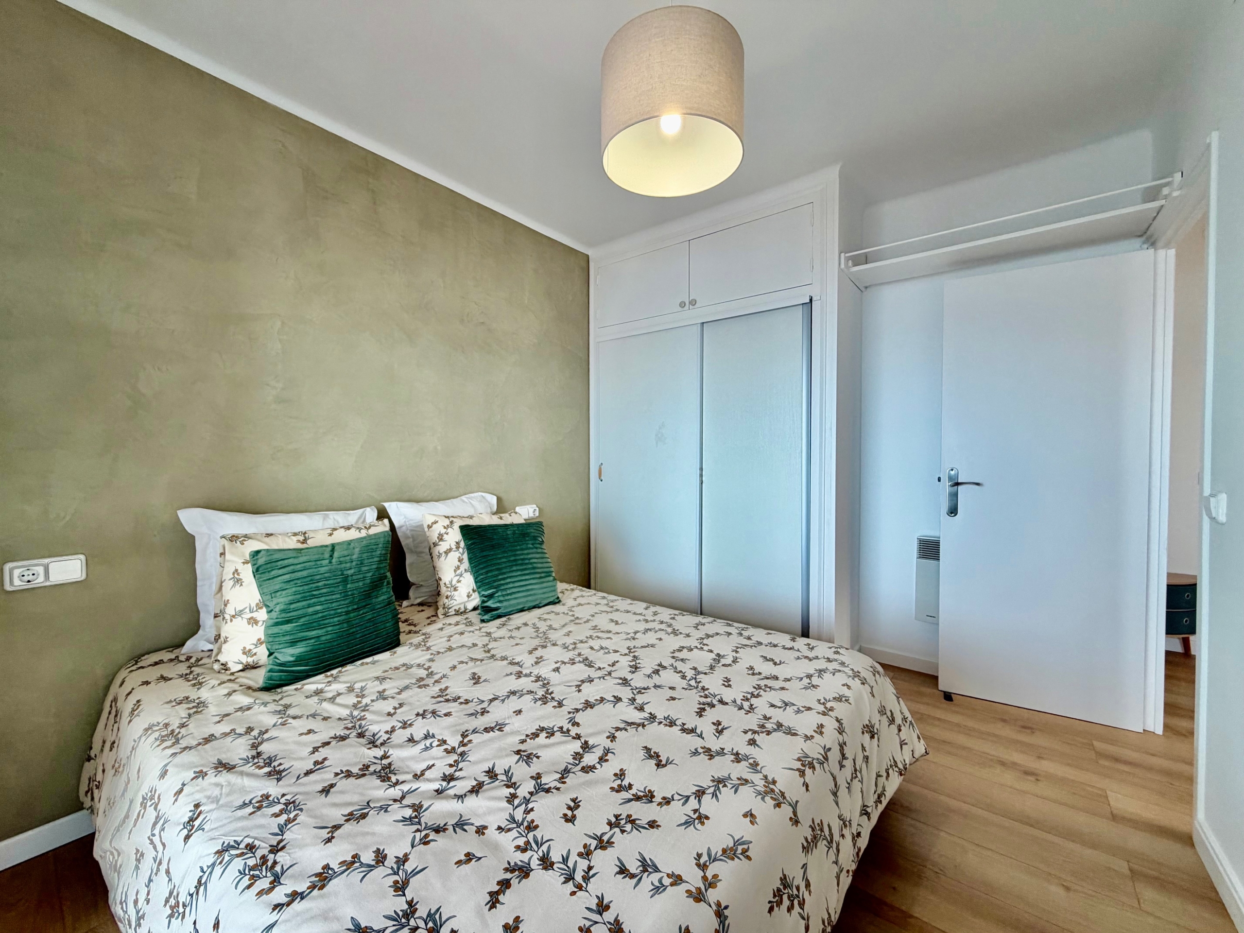 Desde la entrada, la distribución de los espacios seduce por su funcionalidad y elegancia. La sala de estar, muy luminosa con un gran ventanal, se abre a unas vistas impresionantes, visible directamente desde el salón. La terraza, que rodea parcialmente el apartamento, prolonga armoniosamente el espacio interior y es accesible desde uno de los dormitorios.