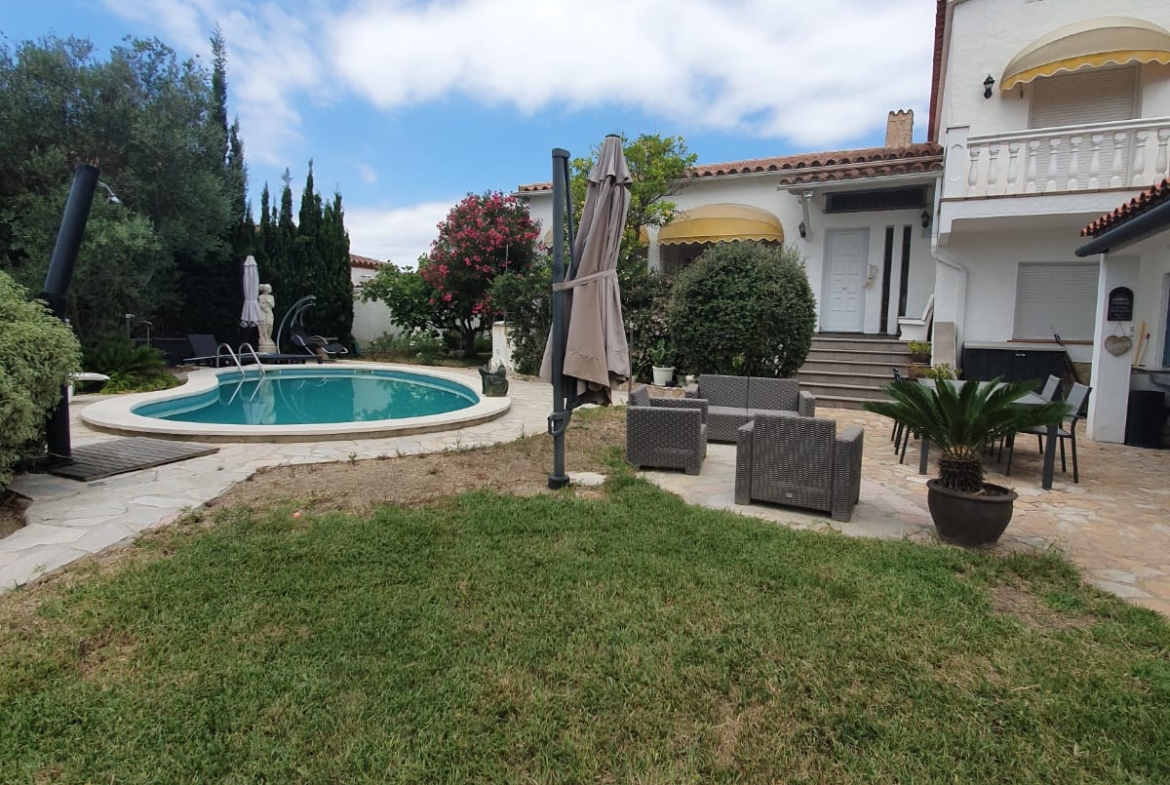 En el exterior encontramos una zona con cocina de verano y zona de comedor con un gran toldo automatizado, gran jardín arbolado y piscina con forma de riñón, desde el jardín accedemos al amarre de 25metros y al garaje para barcos de 16m x 5m, esta propiedad está situada justo en la entrada de un canal, al lado del canal principal por lo que tiene muy buen acceso para las embarcaciones.