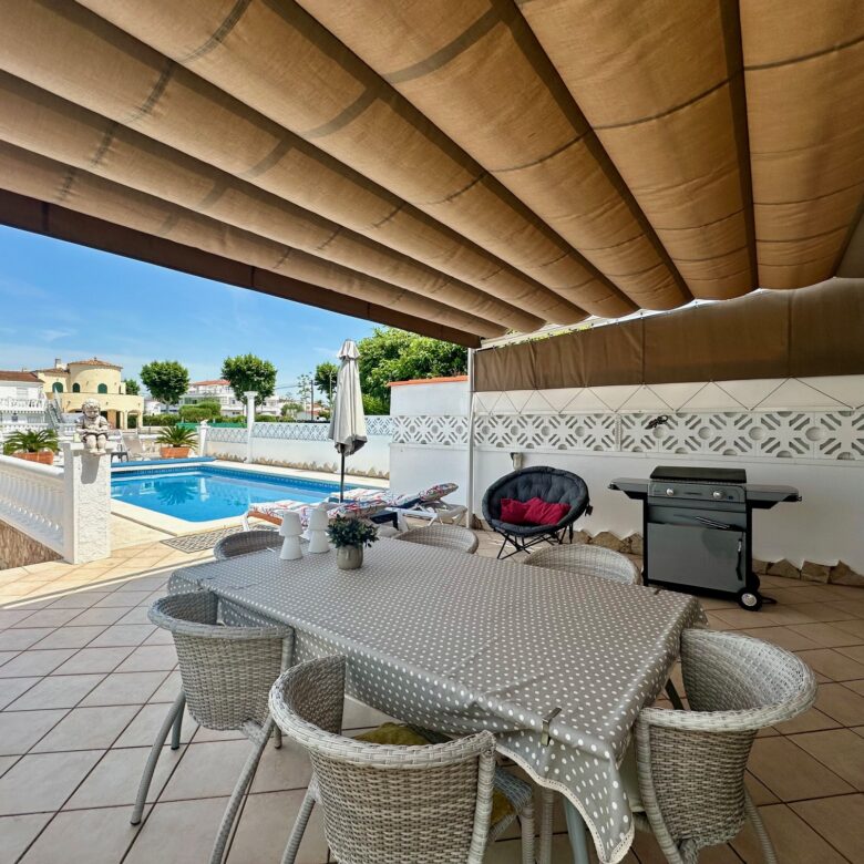 Villa con torre con 280m2 sobre gran parcela de 1.125 m², orientación sur junto al canal, magnífico jardín mediterraneo arbolado y muy cuidado; con amarre de 25 m; gran piscina climatizada, tres amplios dormitorios, tres baños y un wc separado.