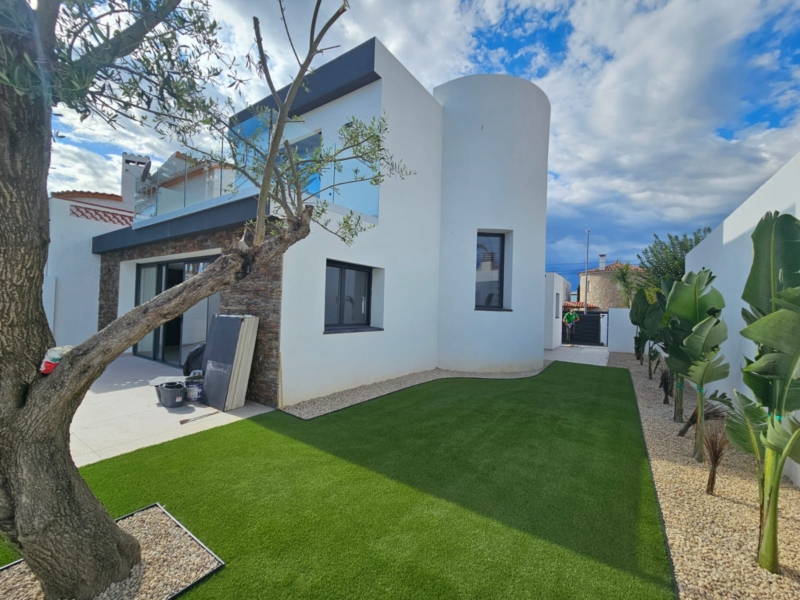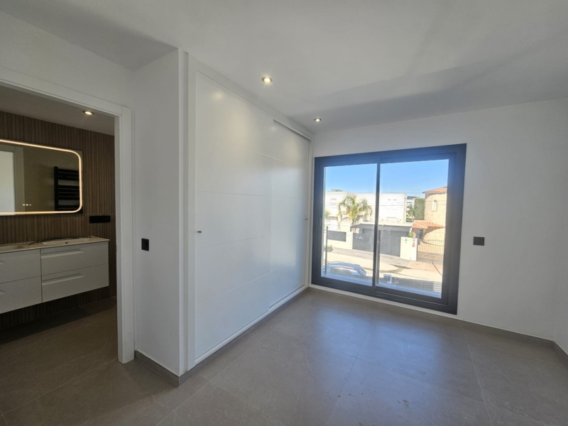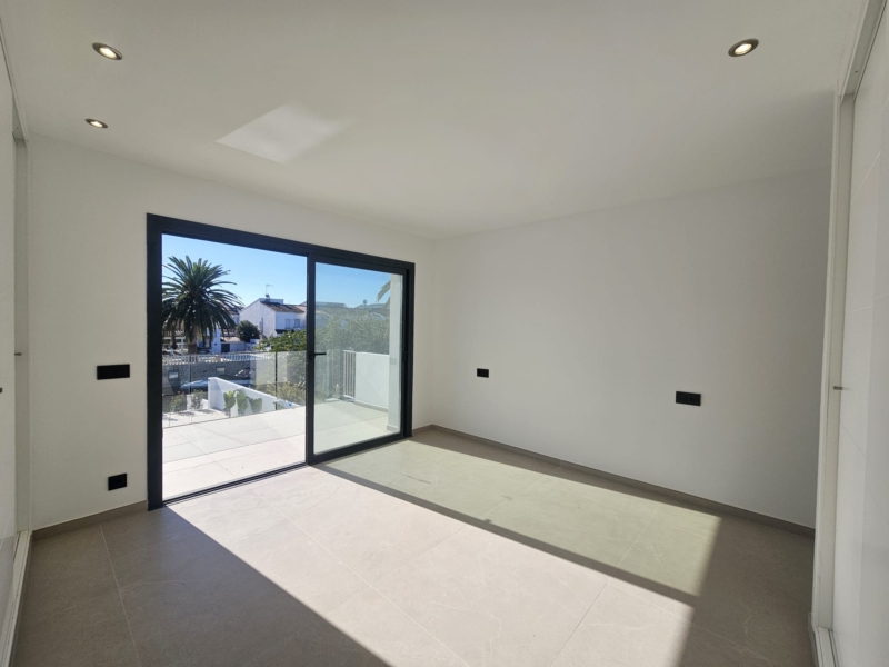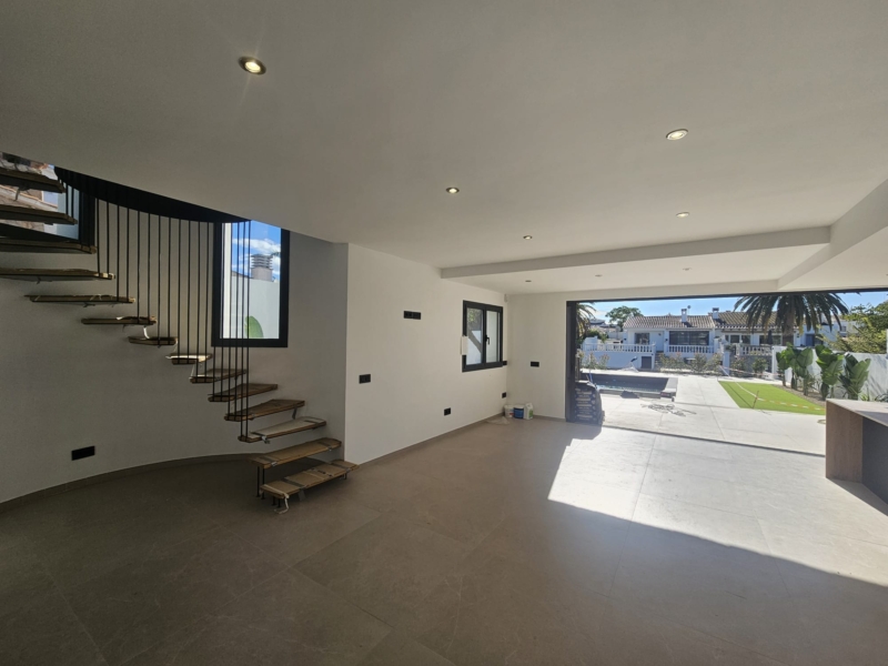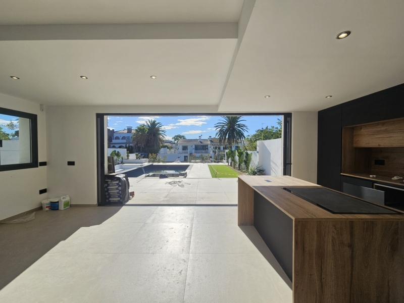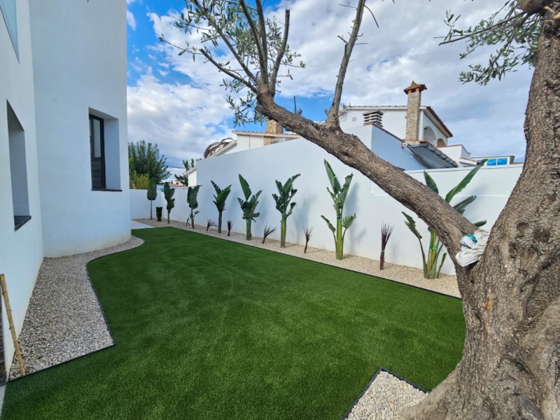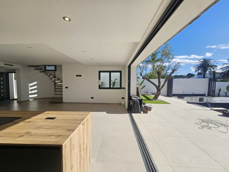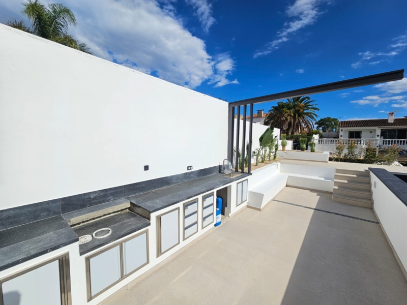 En el exterior de la propiedad, destaca una elegante piscina de 8×4 metros con un jacuzzi integrado de 2×2 metros, perfecto para momentos de relajación. Junto a la piscina, un acogedor chill-out exterior con cómodos sofás y pérgola, creando el lugar perfecto para disfrutar de las tardes y noches al aire libre. La propiedad también cuenta con un amarre de 12 metros.