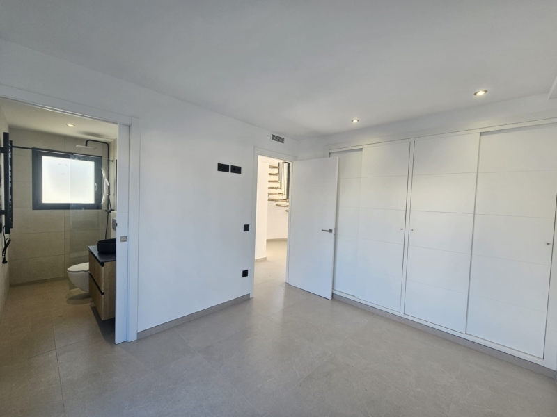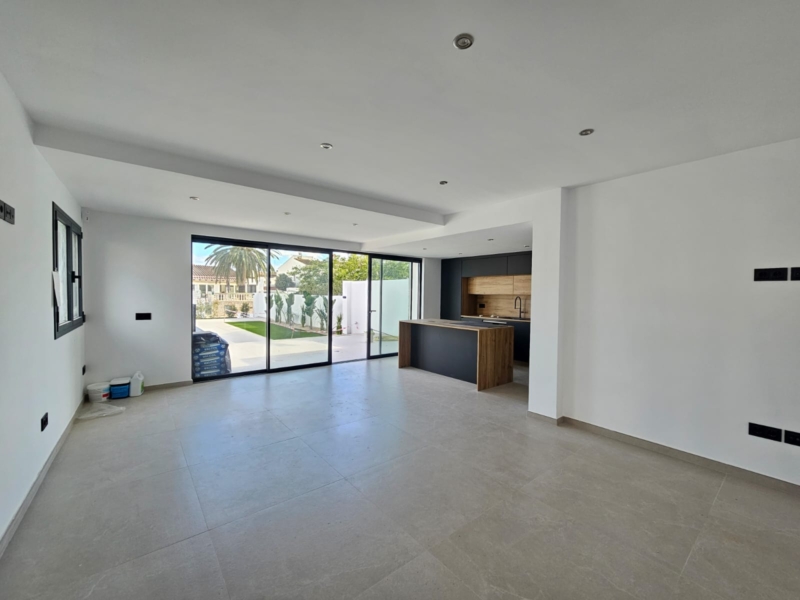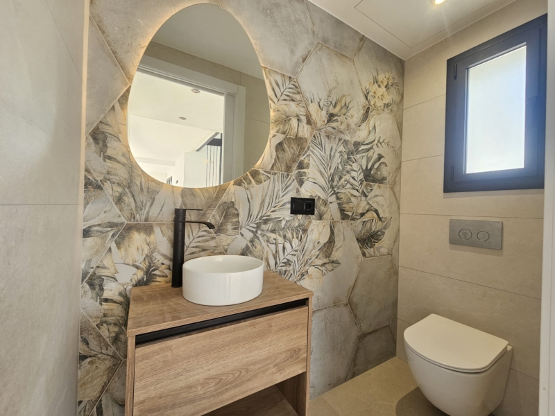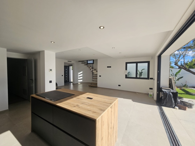 En planta baja, se encuentra una amplia área de salón-comedor-cocina de concepto abierto de aproximadamente 45 m², ideal para reuniones familiares y sociales. Esta zona tiene una conexión fluida con el exterior gracias a sus puertas correderas de cristal, que ofrecen vistas y acceso directo a la piscina y al jardín. También hay una habitación en suite en esta planta, ideal como dormitorio principal, equipada con baño privado. Se incluye un baño de cortesía convenientemente ubicado para el uso de visitantes.