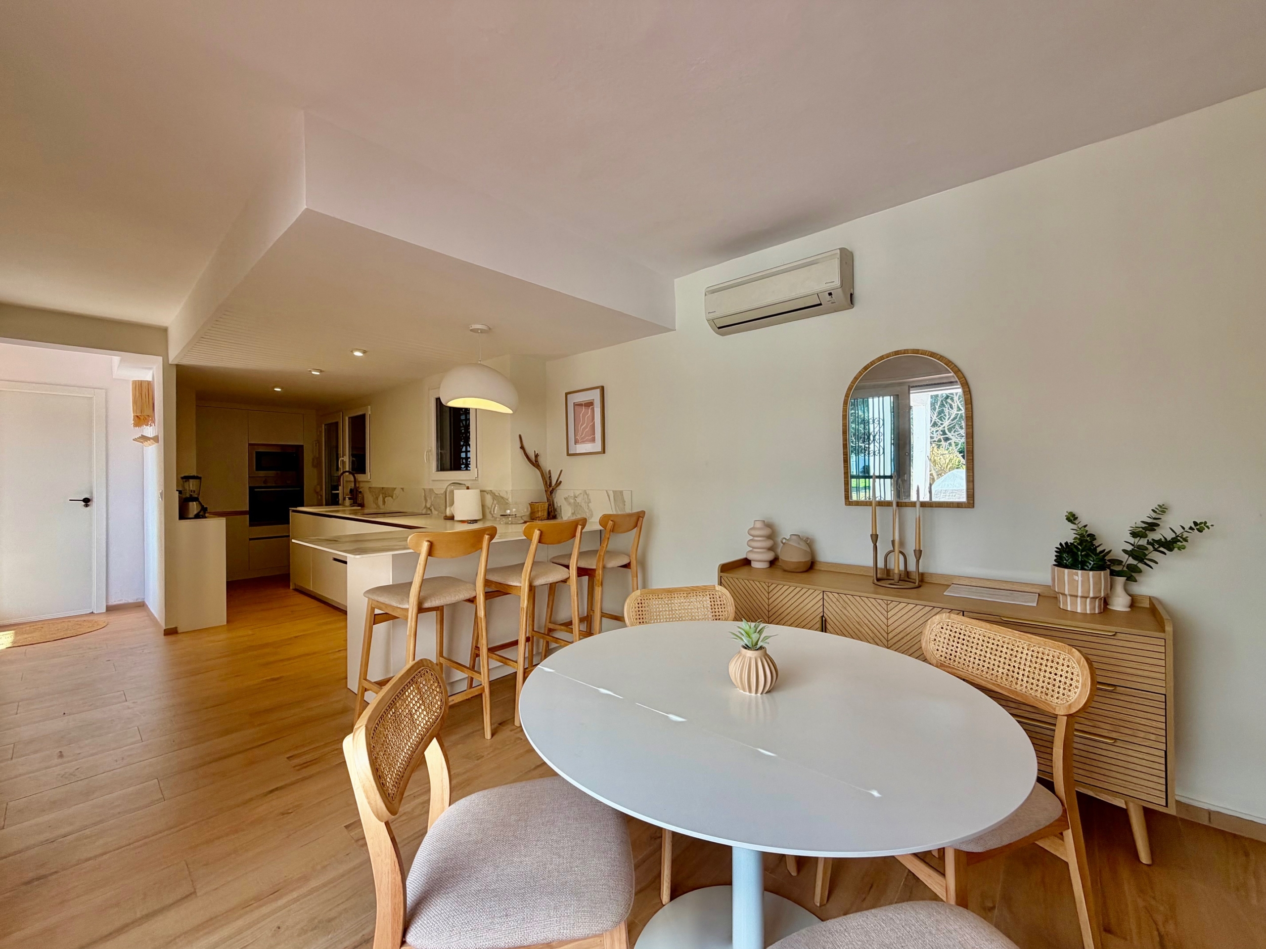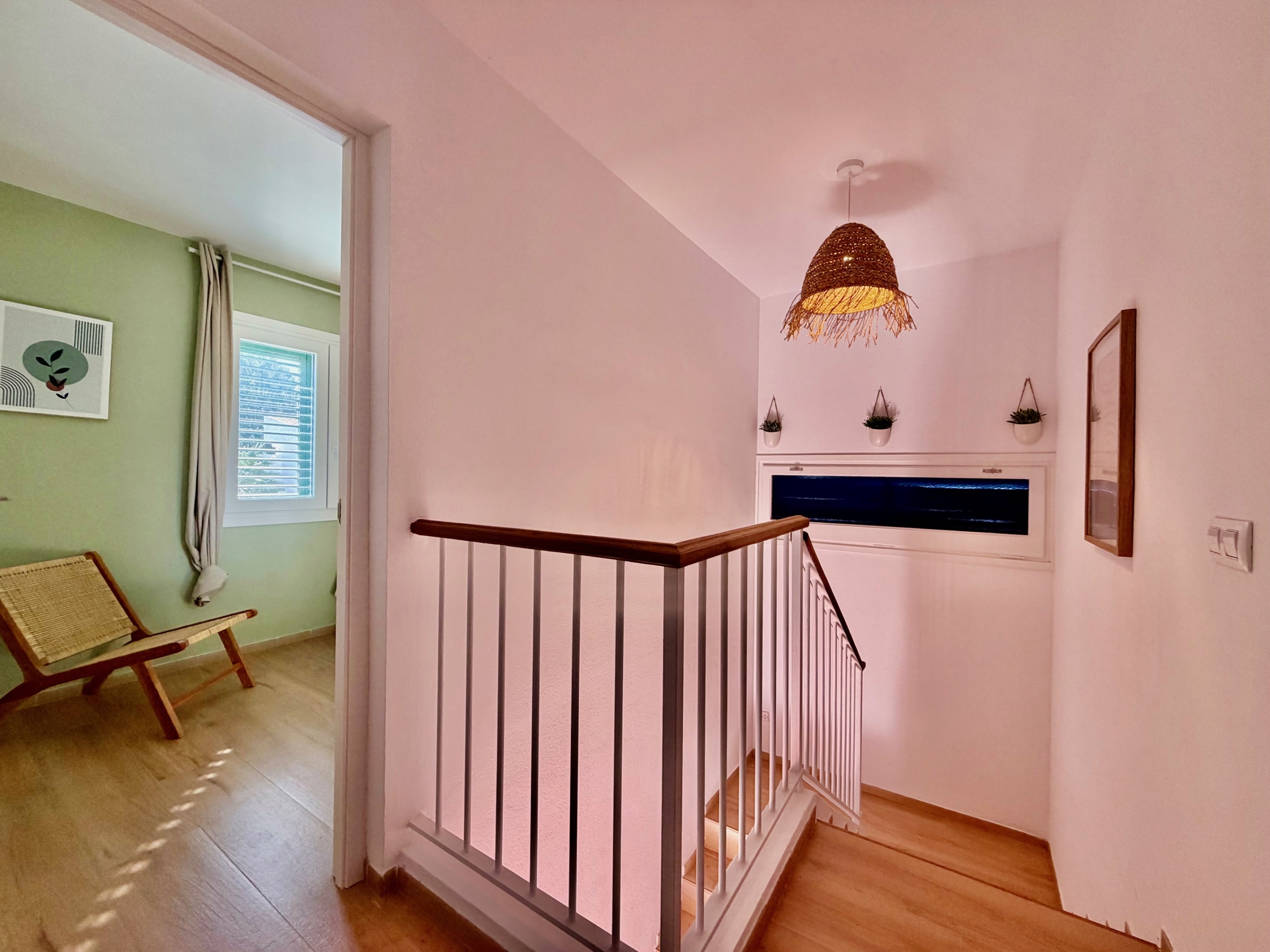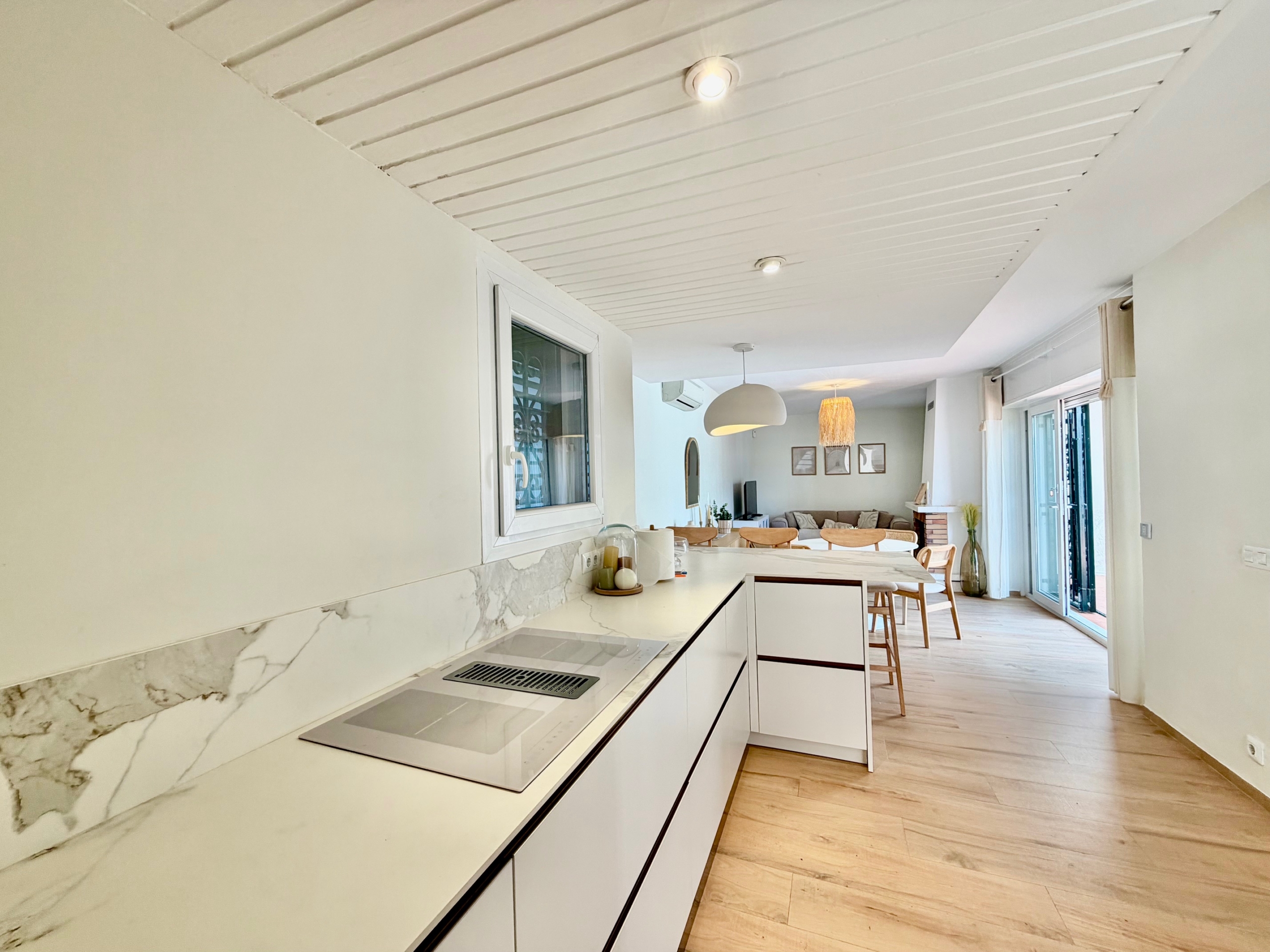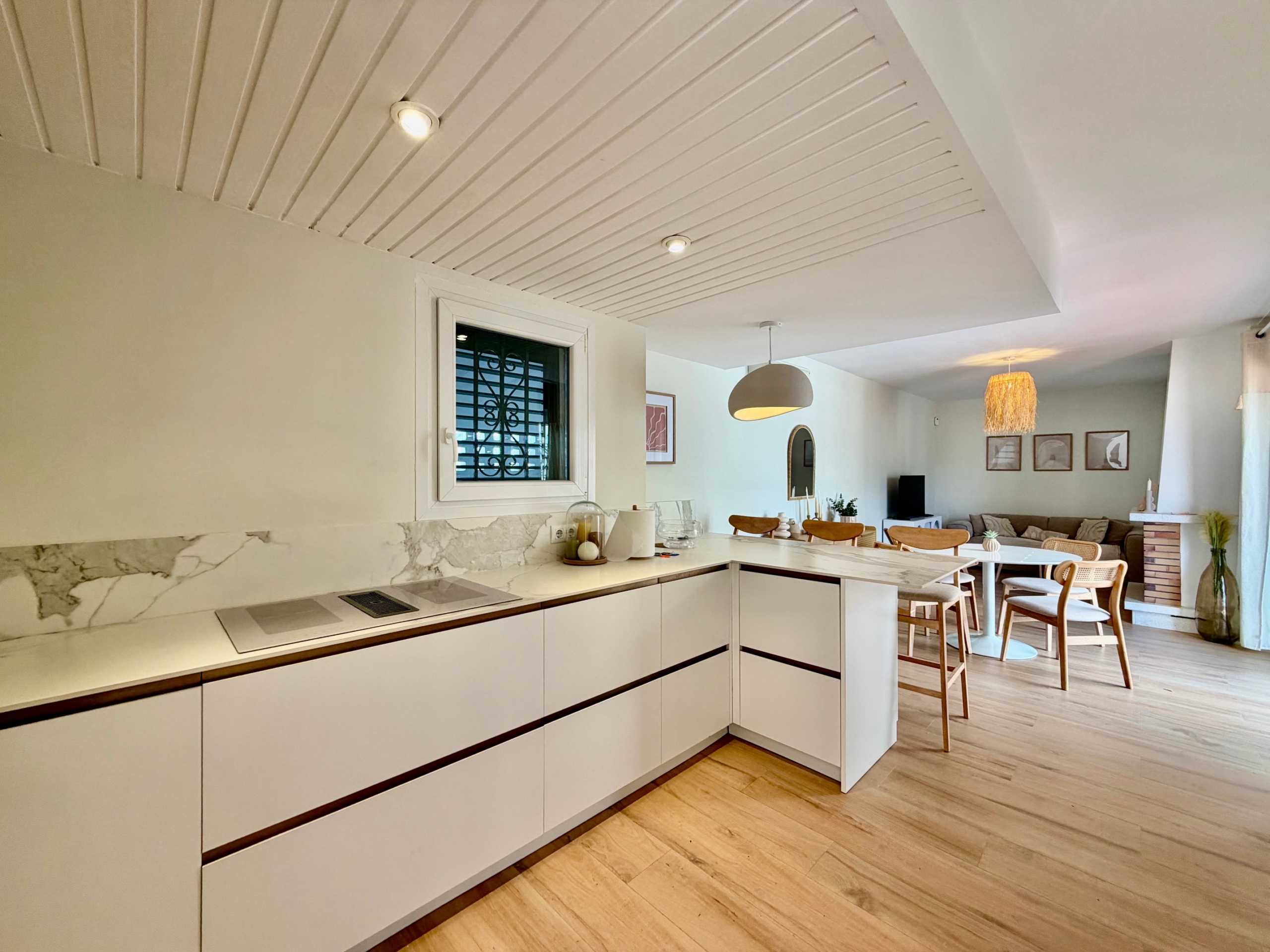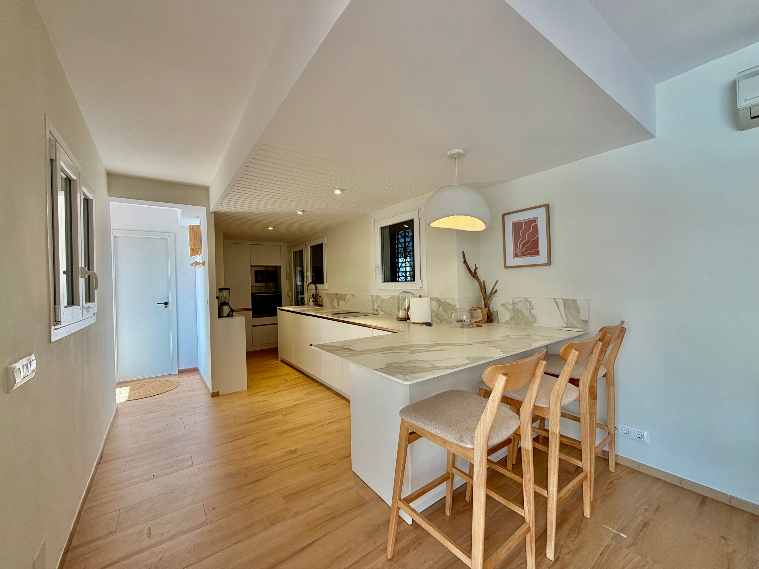 La cocina, totalmente reformada, es moderna y está equipada con electrodomésticos recientes aún en garantía. La zona de estar principal, compuesta por salón, comedor y sala de estar, es cálida y acogedora, con chimenea, ideal para los meses de invierno. Las persianas mallorquinas ayudan a mantener una temperatura agradable durante todo el año en el interior de la propiedad.