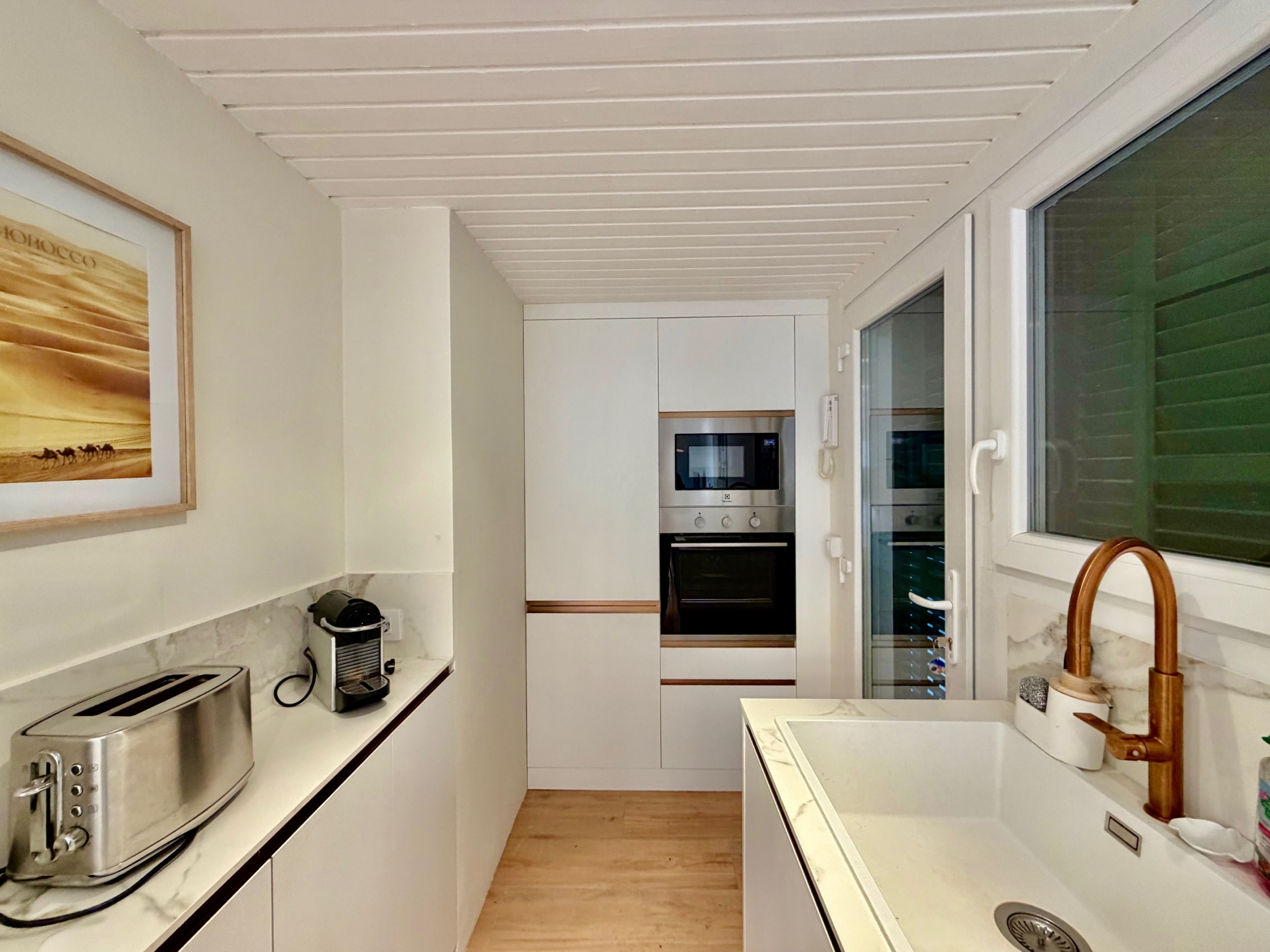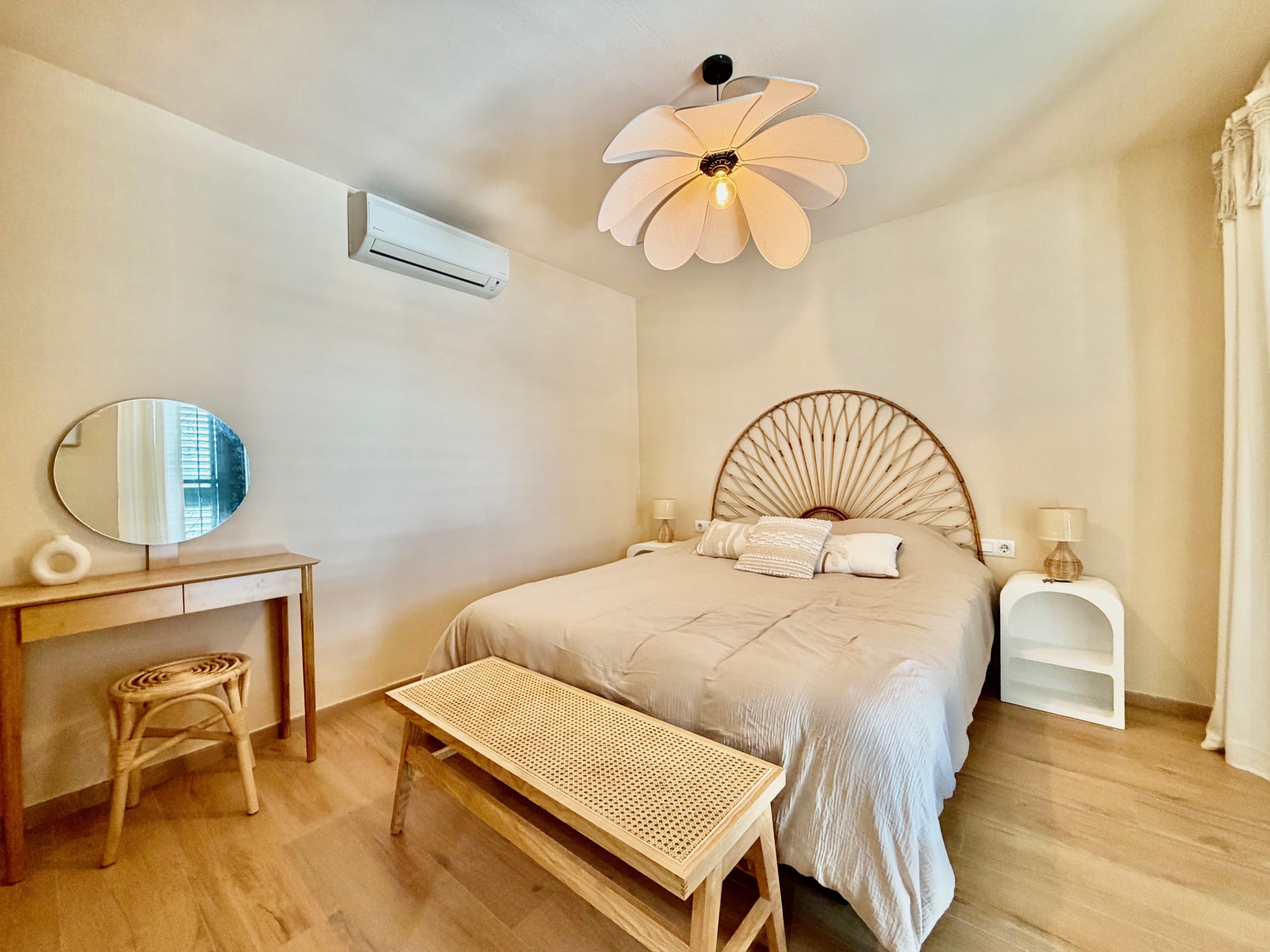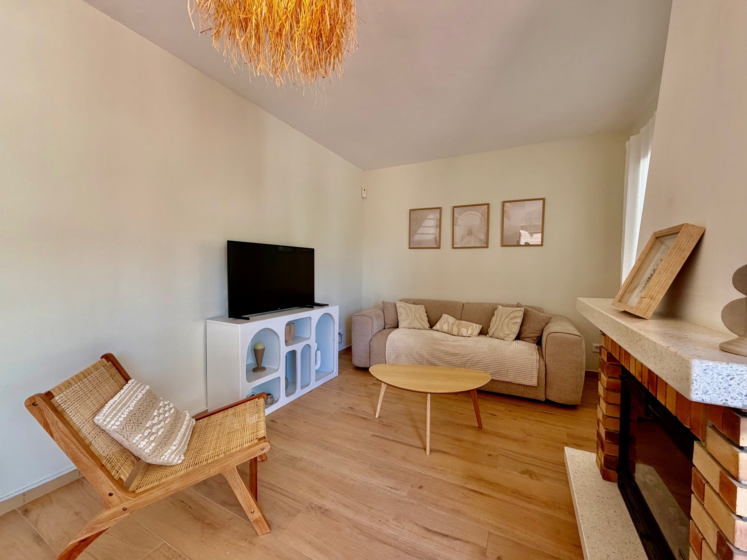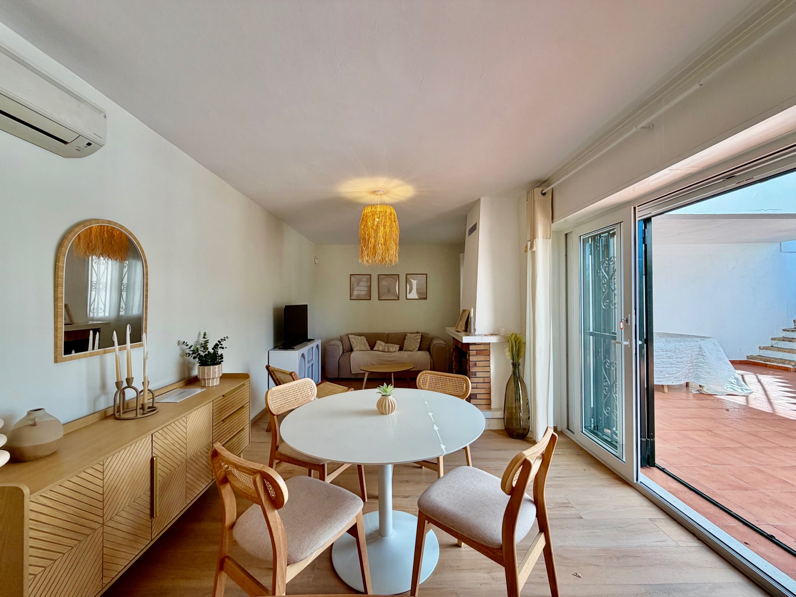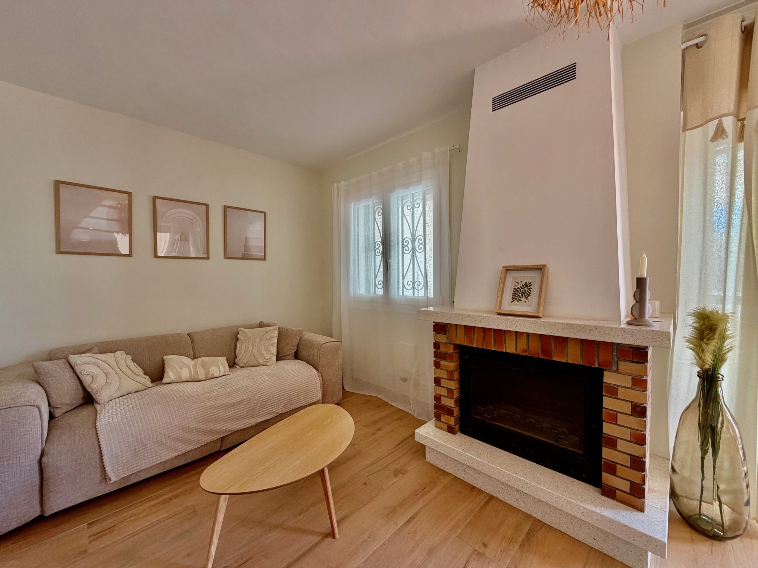 La cocina, totalmente reformada, es moderna y está equipada con electrodomésticos recientes aún en garantía. La zona de estar principal, compuesta por salón, comedor y sala de estar, es cálida y acogedora, con chimenea, ideal para los meses de invierno. Las persianas mallorquinas ayudan a mantener una temperatura agradable durante todo el año en el interior de la propiedad.