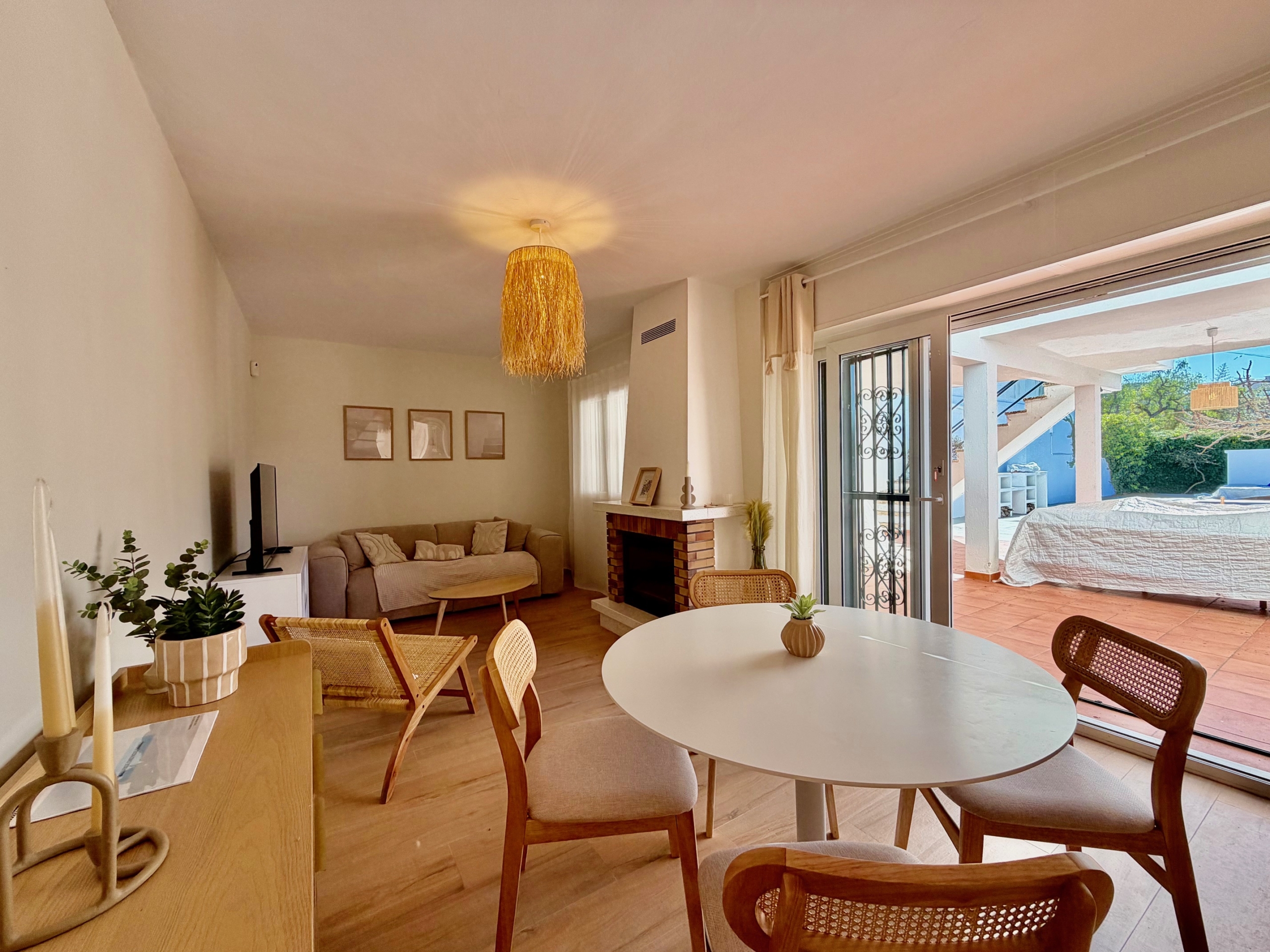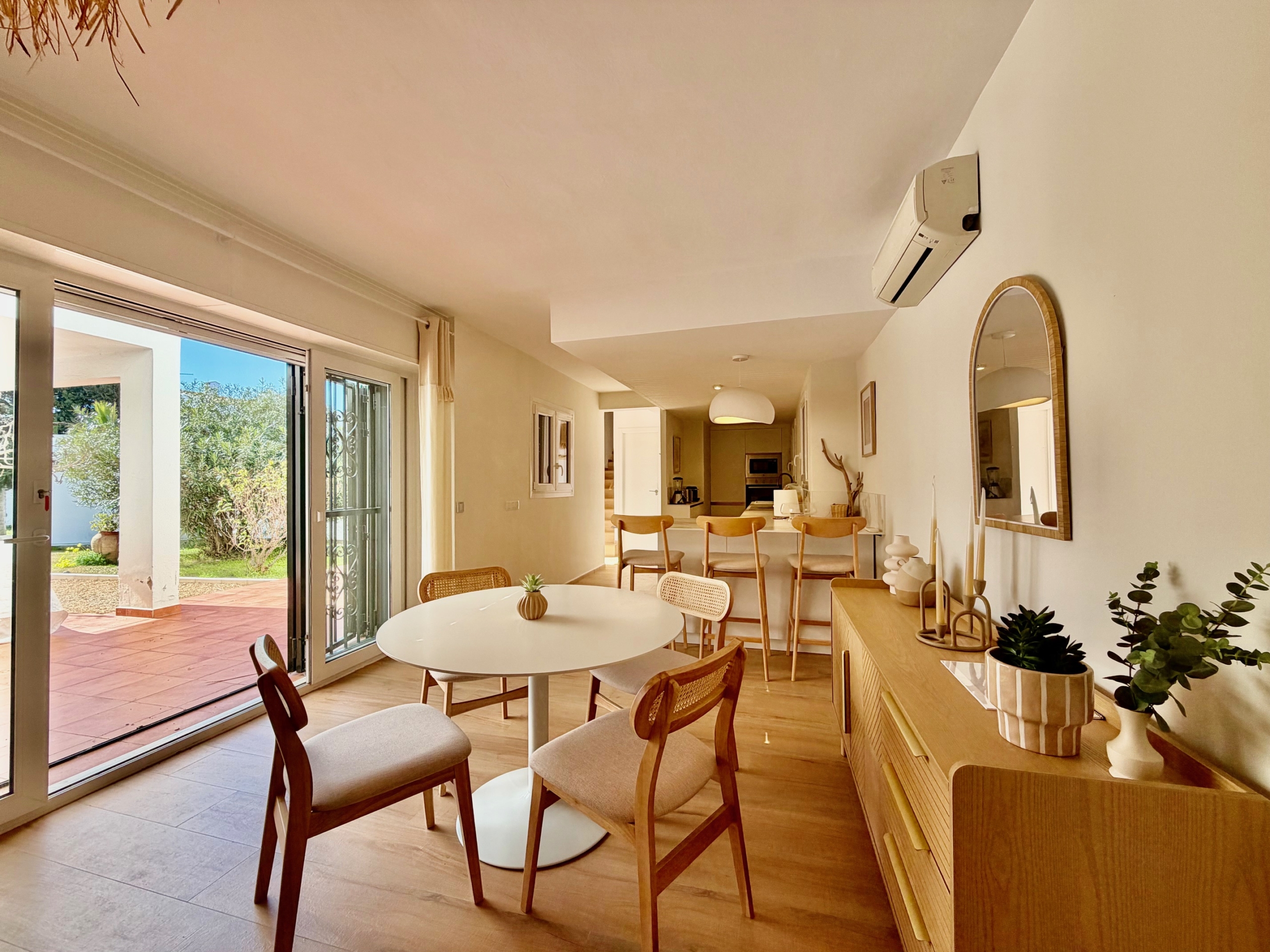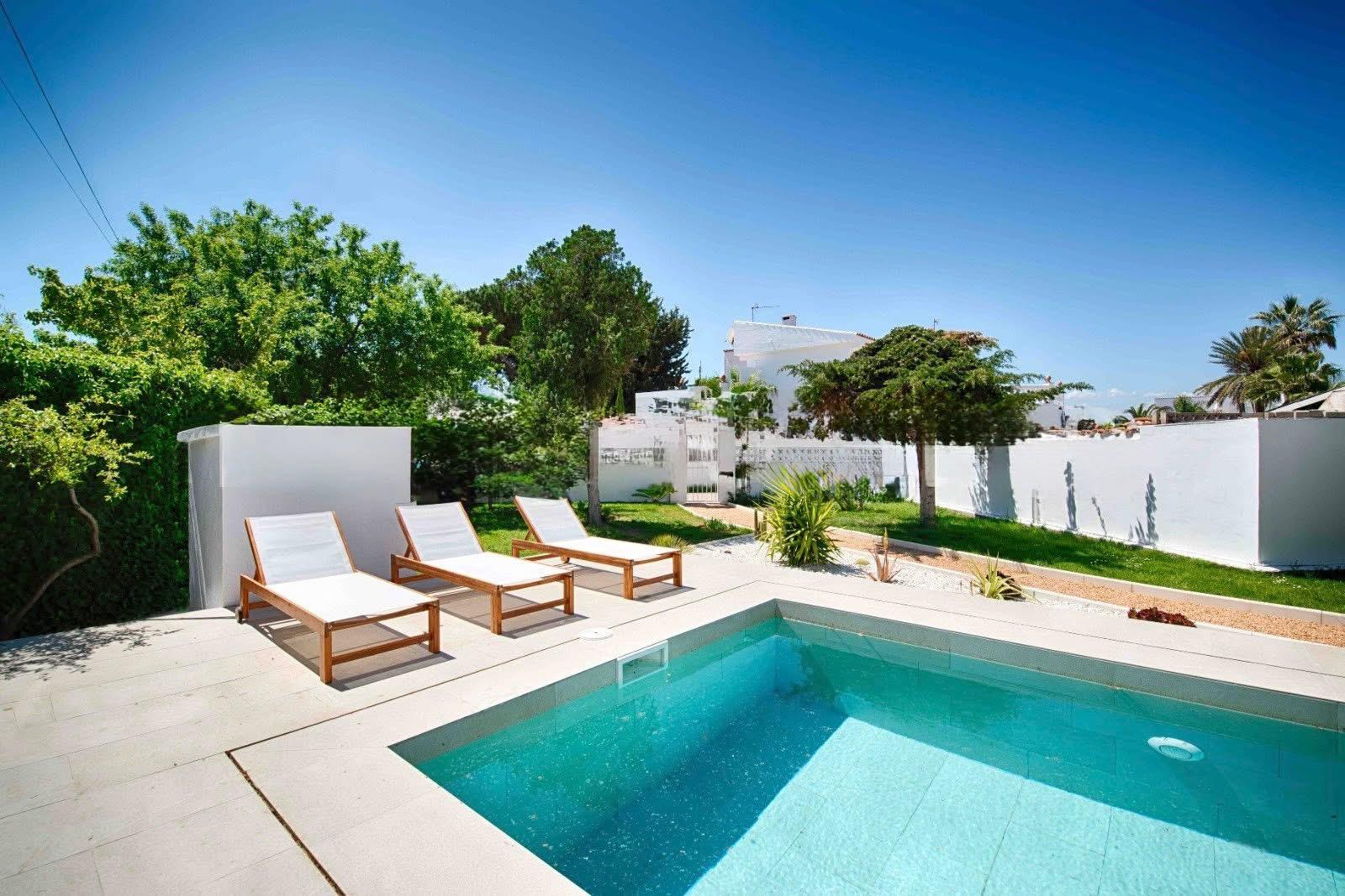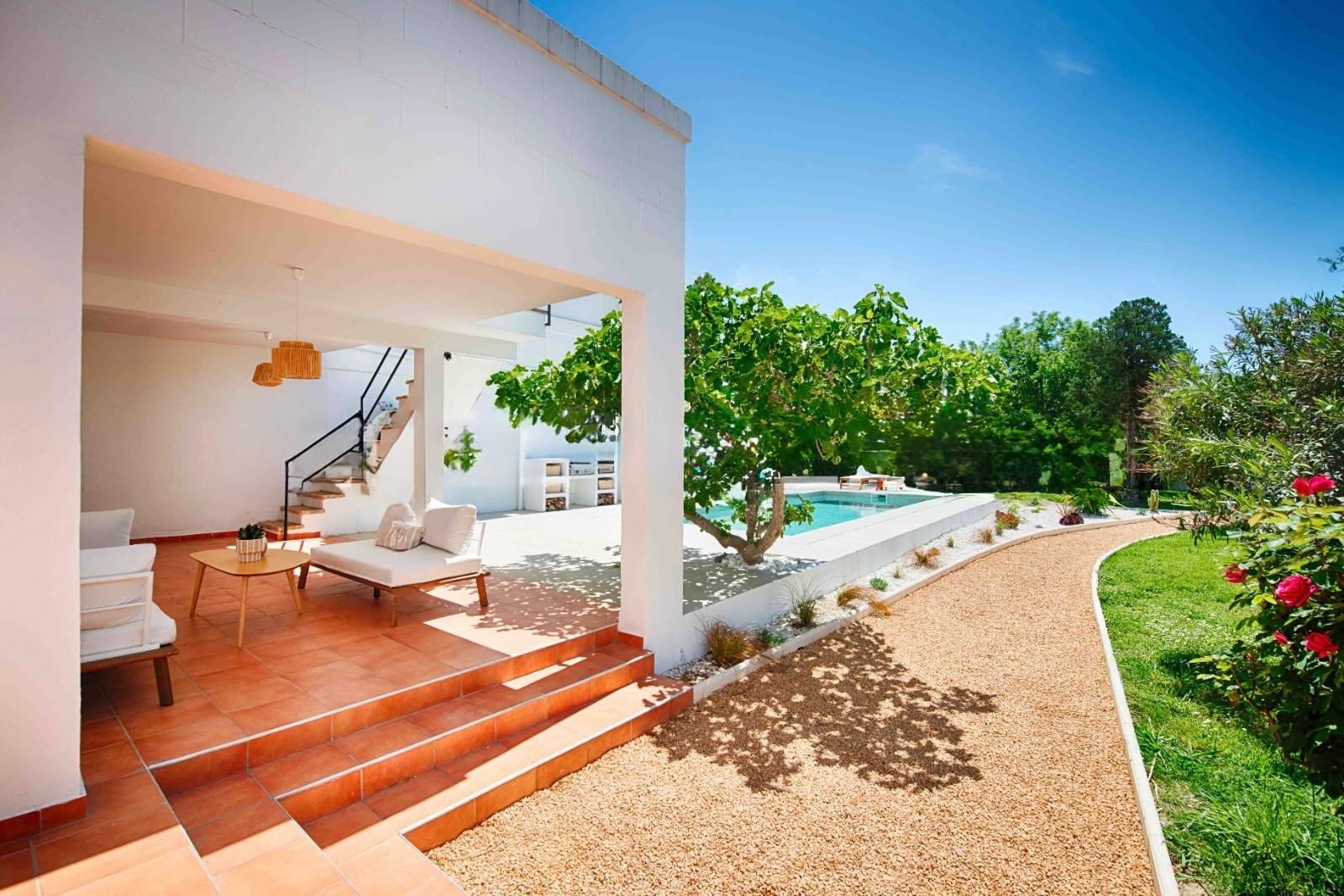 El interior cautiva gracias a la abundante luz natural que inunda cada estancia. La casa cuenta con tres cómodos dormitorios y tres baños completos, incluyendo una suite principal con baño en suite, terraza privada y acceso directo a la piscina, un remanso de paz para la relajación. Un aseo independiente completa la distribución para mayor comodidad.