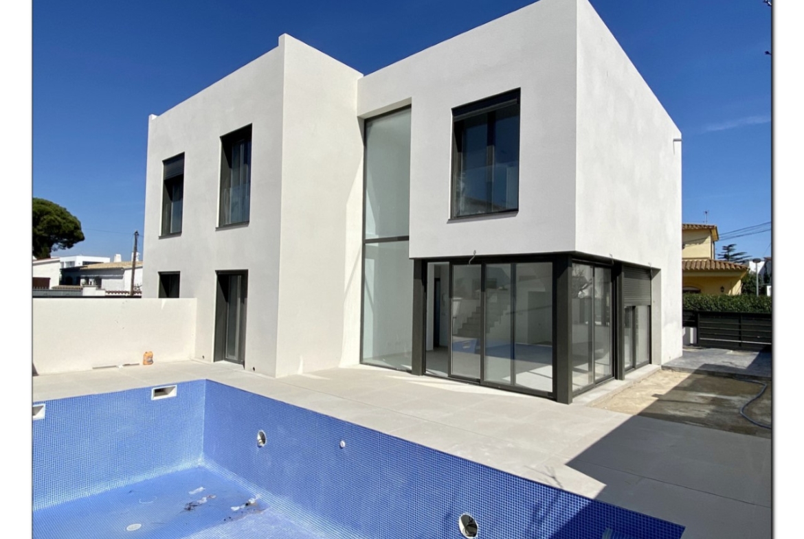 Esta casa se encuentra en el Sector Requesens de Empuriabrava, muy cerca del centro. La casa se distribuye en 2 plantas. En la planta baja cocina abierta al comedor con barra, gran salon con comedor muy luminoso con acceso directo al exterior, terraza, piscina, una habitación doble, un baño completo y escalera de acceso a la primera planta donde encontramos 1 habitación doble con baño privado, 2 habitaciones dobles con otro baño.