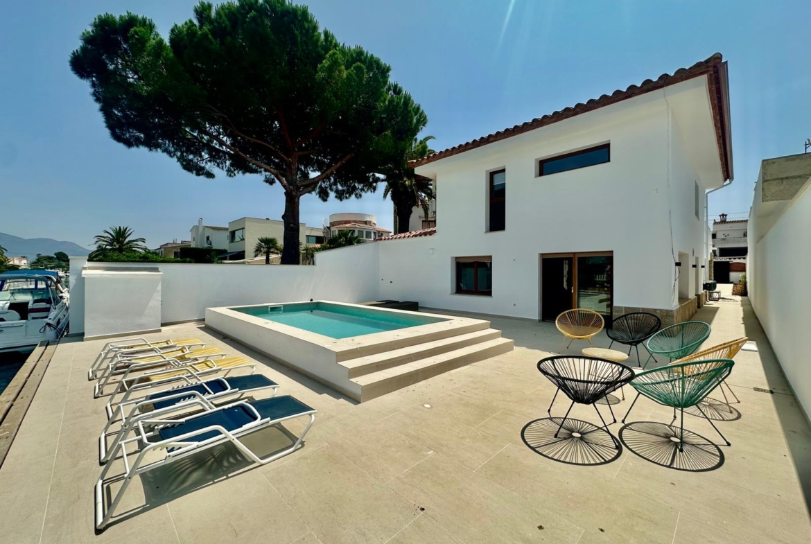 Côté canal, une belle terrasse prolonge les espaces de vie vers l’extérieur et offre un accès direct à la piscine privative ainsi qu’à l’amarre. Un véritable havre de paix, idéal pour se détendre ou recevoir.